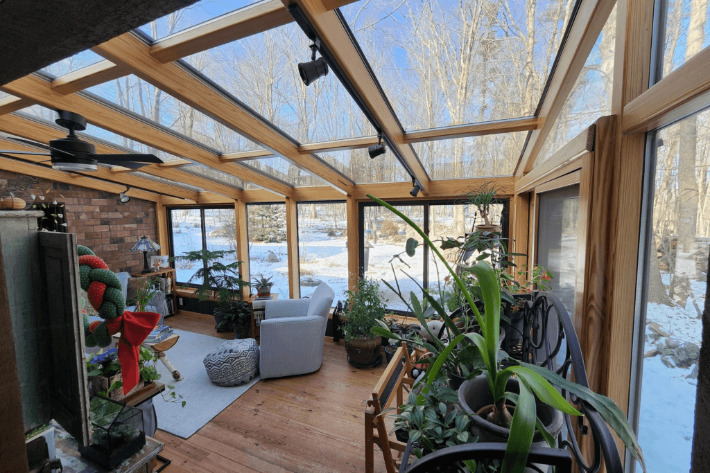 With a glass roof and two glass walls connected to an open concept kitchen, the sunroom was prone to temperature extremes. This included overheating in the summer and losing warmth quickly in the winter. The home’s existing heating and cooling system did not extend into this area effectively, leaving the room uncomfortable for much of the year. The homeowners wanted a quiet, efficient solution that could provide both heating and cooling without altering the sunroom’s open design.